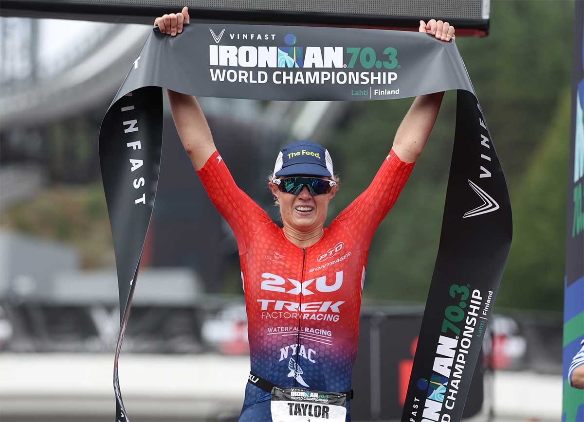 Die amerikanische Olympiateilnehmerin Taylor Knibb hat am Samstag in Lahti, Finnland, ihren zweiten Titel bei den IRONMAN® 70.3® Weltmeisterschaften gewonnen. Nach dem Schwimmen unter den Top 3 holte Knibb sich schnell die Führung auf der Radstrecke und gab sie nie mehr ab. Mit einer dominanten Leistung verteidigte Knibb ihren Titel als Weltmeisterin und das mit einer neuen IRONMAN 70.3-Bestzeit von 3:53:02. Damit unterbot sie die bisherige Bestzeit von 3:53:03, die 2022 von Laura Phillip aus Deutschland aufgestellt wurde.